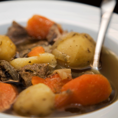 Add the water or stock according to your preference of a “dry” stew or a “wet” stew. A good stew should have some gravy but not be “too wet”. It’s best to add more stock later than too much at the start. Bring the stew to a boil, cover as tightly as possible. Either reduce the heat to a simmer and cook on top of the stove or place in a preheated oven at 160ºC (Gas Mark 3, 325ºF) for 2½ - 3 hours until the meat is tender. Keep an eye on it towards the end, and adjust the gravy by adding a little water if you think it too dry.